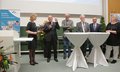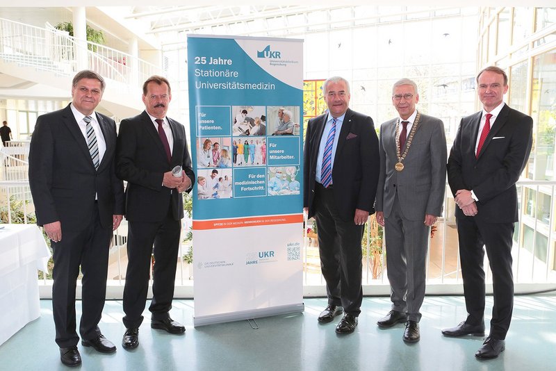 Begangen den Festakt zu 25 Jahren stationärer Universitätsmedizin (v.l.n.r.): Klaus Fischer (Kaufmännischer Direktor UKR), Prof. Dr. Michael Albrecht (Vorsitzender des Verbandes der Universitätsklinika Deutschlands), Dr. Ludwig Spaenle (Bayerischer Staatsminister für Bildung und Kultus, Wissenschaft und Kunst), Prof. Dr. Udo Hebel (Präsident der Universität Regensburg), Prof. Dr. Oliver Kölbl (Ärztlicher Direktor UKR). Foto: © UKR