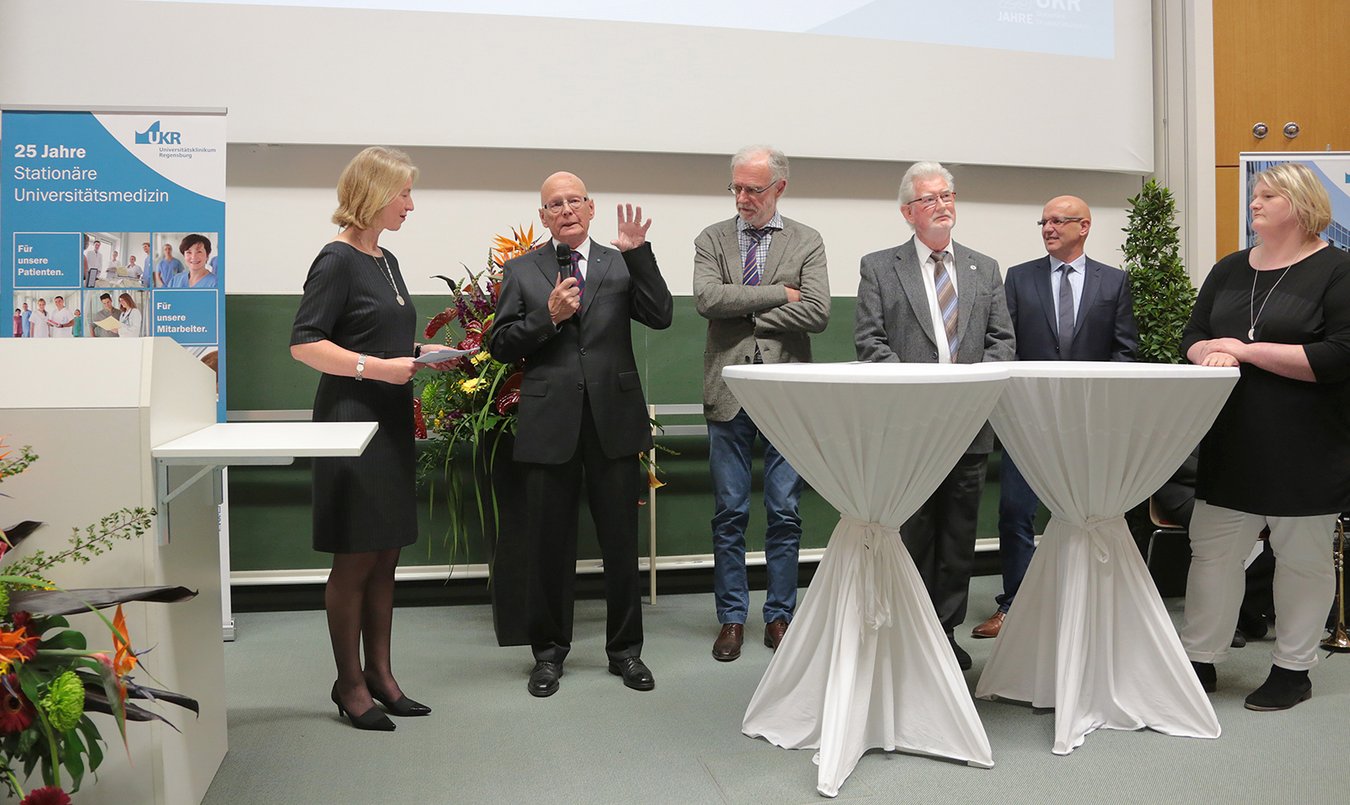 Das Universitätsklinikum Regensburg ist mit seinen heute mehr als 4.400 Mitarbeitern einer der größten Arbeitgeber der Region. Viele der Beschäftigten gehören seit Inbetriebnahme dazu. Beim heutigen Festakt erzählten Professoren und Mitarbeiter der ersten Stunde von ihren Erfahrungen im UKR, darunter Professor Dr. Kai Taeger, der erste Ärztliche Direktor des UKR, sowie Professor Dr. Ferdinand Hofstädter, von 1991 bis 1993 Dekan der Fakultät für Medizin. Dr. Hans Brockard, der von 1991 bis 2006 als erster Kaufmännischer Direktor am UKR tätig war, berichtete von der Ausgangssituation: „Als wir im Februar 1991 in Regensburg mit dem Auftrag eintrafen, das Klinikum bis Mitte 1992 in Betrieb zu nehmen, standen wir vor einigen Herausforderungen. So lag das Klinikum mit einer eigenen Unfallchirurgie zwar nur einen Steinwurf von der Autobahn entfernt, hatte aber keinen eigenen Autobahnanschluss, für die neuen Kliniken standen noch keine Forschungsflächen zur Verfügung, es existierten für das 500-Betten-Haus nur 250 Parkplätze für Mitarbeiter, Besucher und Patienten, das Haus verfügte noch über über keine EDV-Verkabelung und der damalige Stellenplan war an einigen Stellen sehr knapp. Für die Inbetriebnahme war deswegen einiges an Vorarbeit nötig, die ohne die massive Hilfe der Universität, des Wissenschaftsministeriums und der Bauverwaltung nicht zu leisten gewesen wäre.“