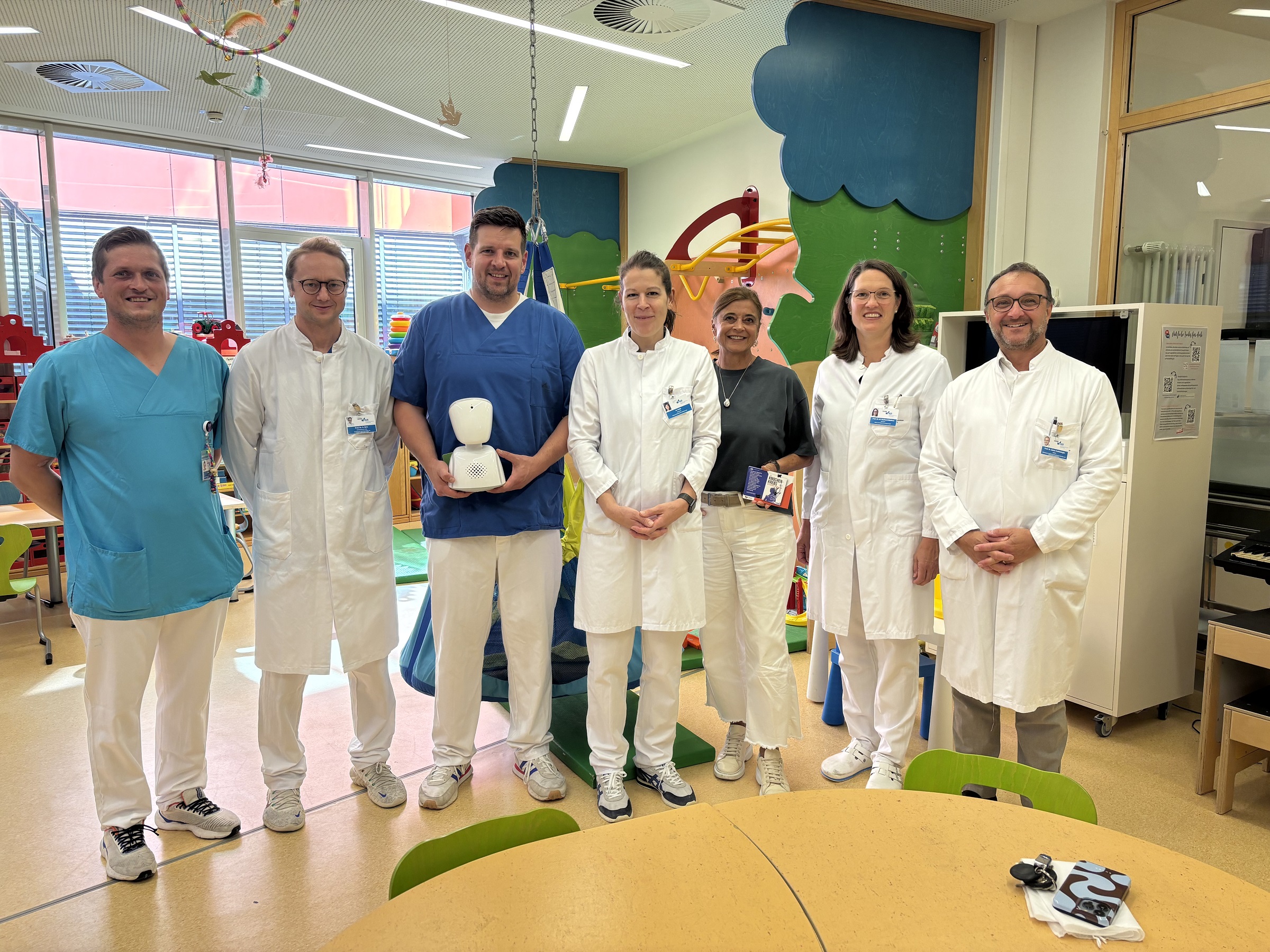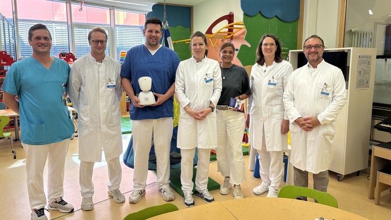 Stark zusammen im Kampf gegen den Krebs (v.re.): Prof. Selim Corbacioglu, Prof. Maya Niethard, Gabriele Goess, Helena Arias, Dr. Daniel Mahr, Prof. Sebastian Geis und Fabian Haberzeht freuen sich über den Lernavatar für die Kinder. © UKR/Matthias Dettenhofer