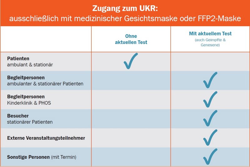 Eine Übersicht über die derzeit gültigen Corona-Regelungen am UKR finden Sie hier: https://www.ukr.de/corona-hinweise