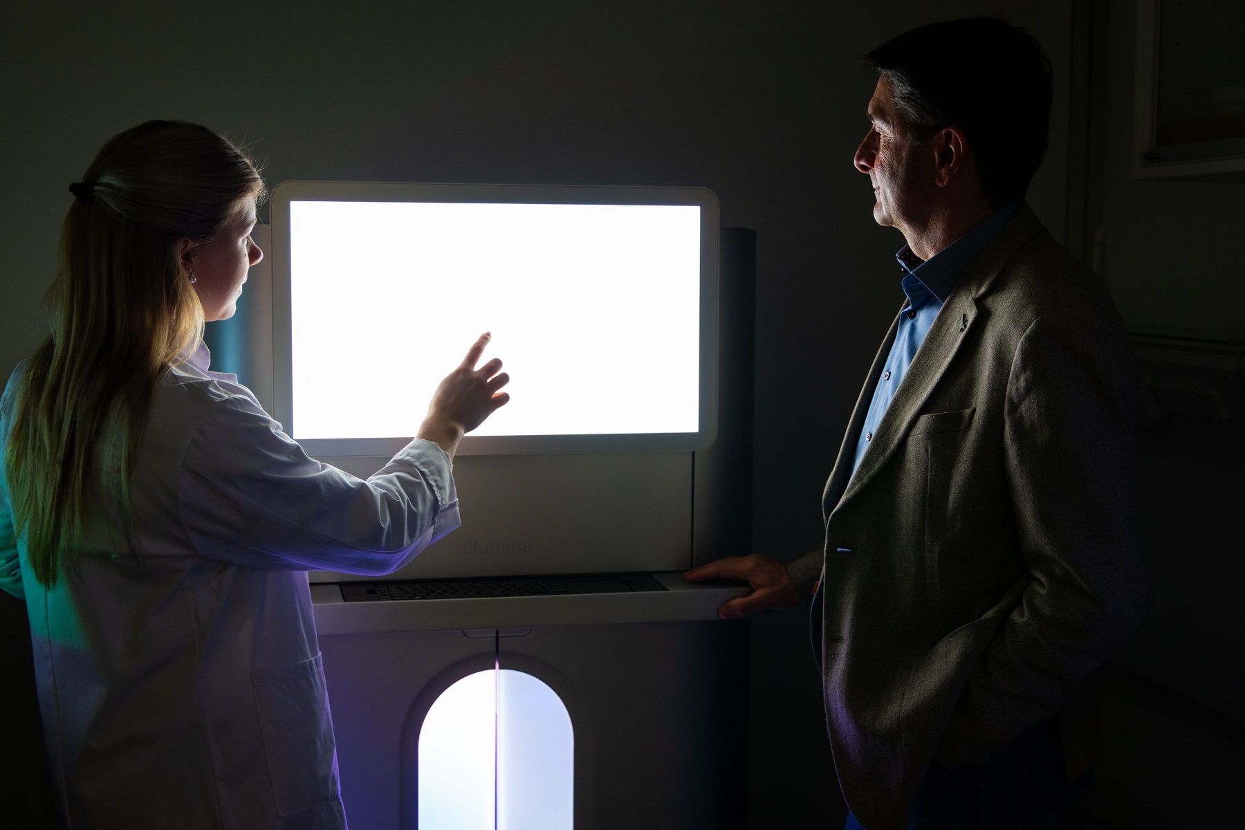 Das neue hochmoderne Sequenziergerät erlaubt es dem Team um Professor Weber (re.) in nicht weniger als 48 Stunden bis zu 128 Genome von Patienten Baustein für Baustein aufzuschlüsseln. © UKR/Franziska Holten