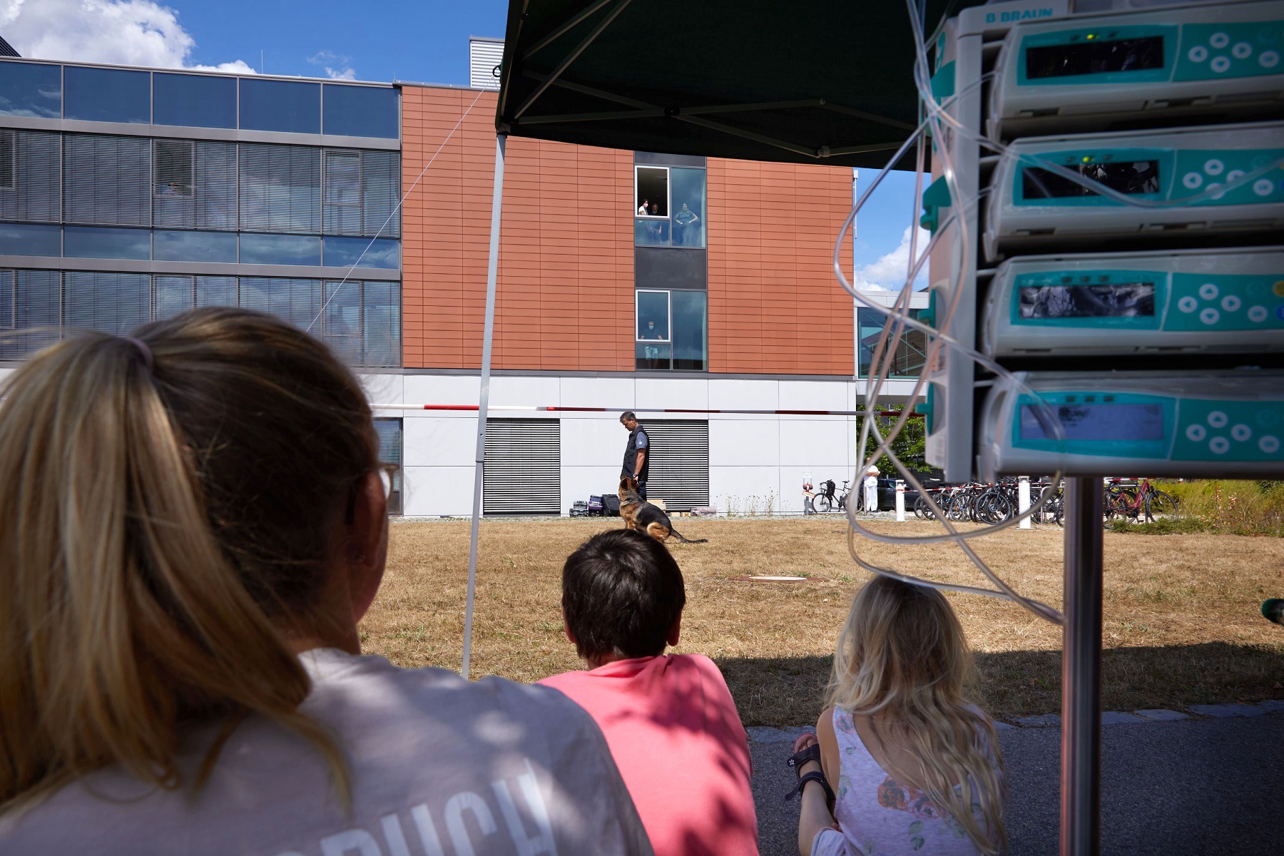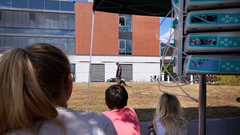 Ein weiterer Höhepunkt der Vorführung war sicherlich der Einsatz der Schutzhunde. „Schutzhunde sind darauf trainiert, in gefährlichen Situationen einen möglichen Täter zu verfolgen und zu stellen. Das erleichtert die Arbeit der menschlichen Kollegen enorm- Ein Hund ist nun einmal deutlich schneller als ein Mensch“, erklärt Michael Lochner, Pressesprecher des Hauptzollamts Regensburg. „Es ist einfach schön zu sehen, wie unsere Hunde und unsere Kollegen die Kinderaugen zum Strahlen bringen. Wir freuen uns, dass wir unseren Beitrag dazu leisten können, den Kindern einige schöne Augenblicke zu schenken“, so der Zollbeamte weiter. Elisabeth Mosena, Sozialpädagogin in der Klinik und Poliklinik für Kinder- und Jugendmedizin des UKR, ergänzt: „Abwechslung ist für unsere Kinder ein ganz wichtiger Baustein auf ihrem Weg durch ihre Erkrankung und ihren stationären Aufenthalt am UKR. Daher freut es mich immer, wenn wir so tolle Programmpunkte mit so tollen Protagonisten anbieten können.“ So oder so, den Kindern hat’s gefallen und eine Wiederholung ist nicht ausgeschlossen.