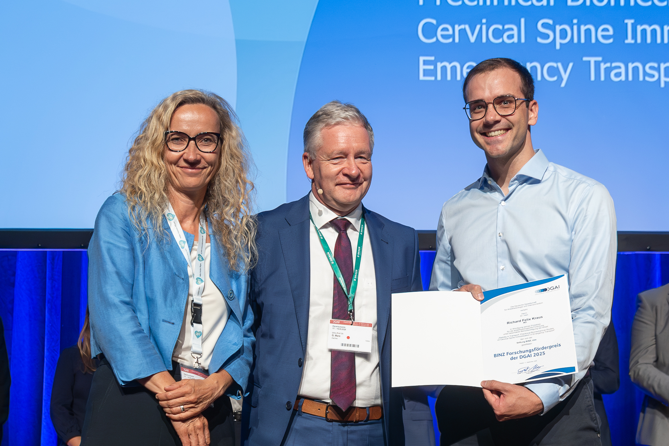 Im Rahmen des Jahreskongresses der Deutschen Gesellschaft für Anästhesiologie und Intensivmedizin e.V. (DGAI) wurde der BINZ-Forschungsförderpreis 2025 an Dr. Richard Felix Kraus, Assistenzarzt der Klinik für Anästhesiologie des Universitätsklinikums Regensburg (UKR), verliehen. Kraus erhält den Preis für seine Studie zur Stabilisierung der Halswirbelsäule im Notfall. Der Preis ist mit 15.000 Euro dotiert.