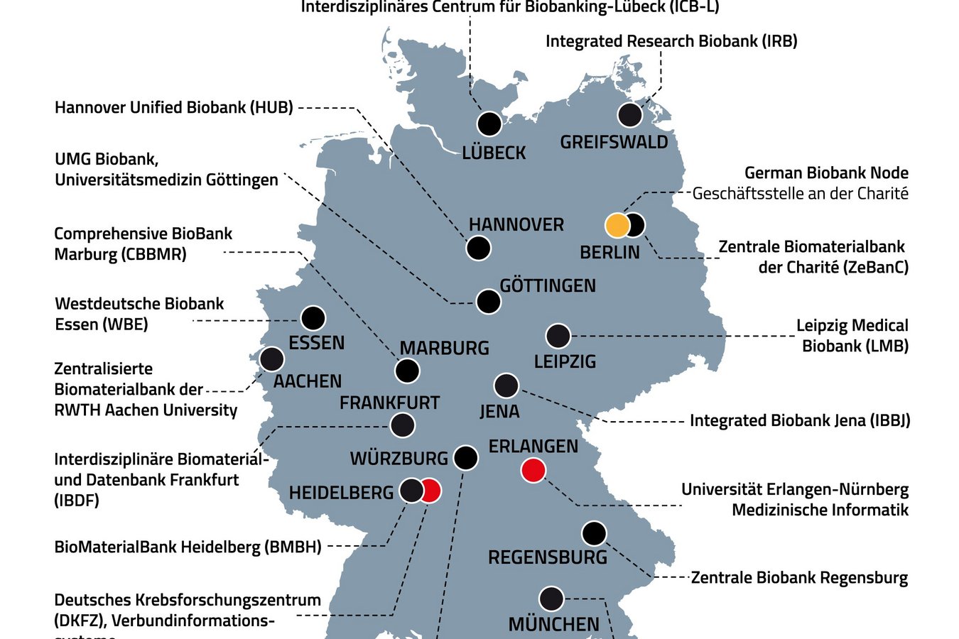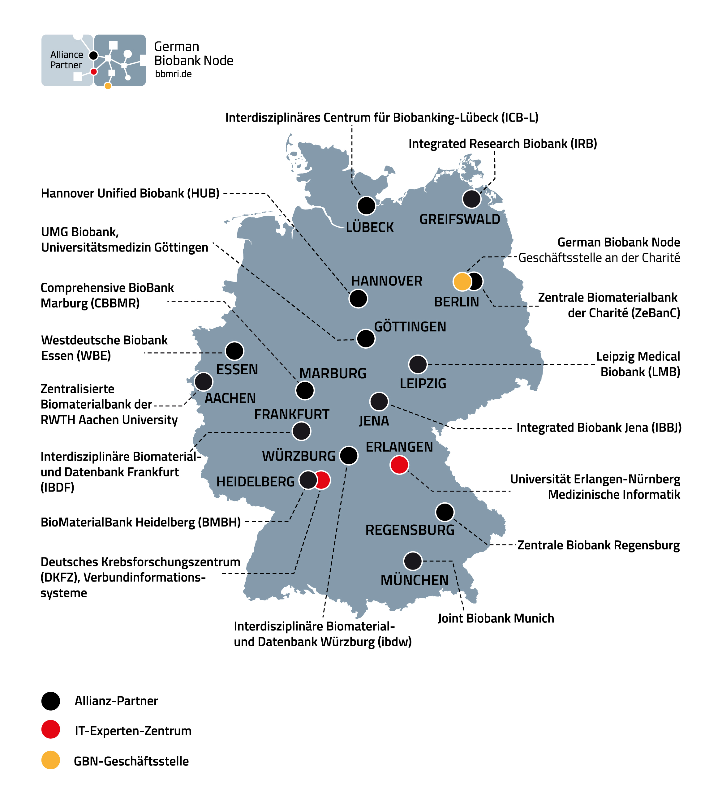 Unter der Leitung des German Biobank Node (GBN) haben sich 2017 Biobanken aus elf deutschen Universitätskliniken sowie zwei IT-Zentren in der German Biobank Alliance (GBA) zusammengeschlossen, 2019 folgten vier weitere Biobankstandorte. Die Partner etablieren gemeinsame Qualitätsstandards und machen ihre Biomaterialproben europaweit für die medizinische Forschung verfügbar. Die seit 2017 beteiligten Allianzpartner werden durch das Bundesministerium für Bildung und Forschung (BMBF) gefördert.