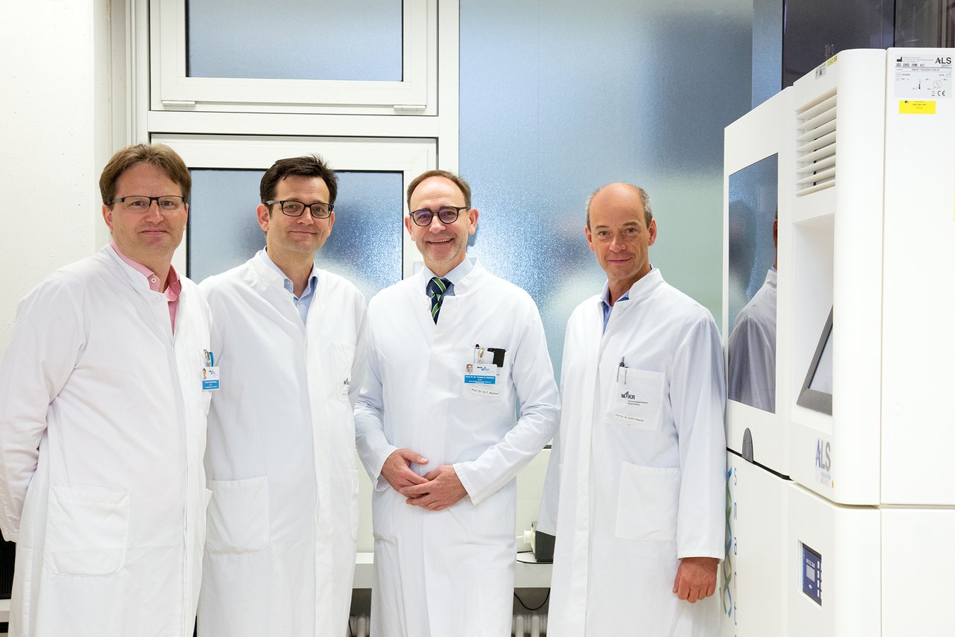 Betreiber und Nutzer der Biobank Regensburg vor dem Smartfreezer, in dem Bioproben gelagert werden (v.l.n.r.): Professor Dr. Tobias Pukrop (Vorstandsvorsitzender des Comprehensive Cancer Center Ostbayern, CCCO), Prof. Dr. Christoph Brochhausen-Delius (Leiter der Zentralen Biobank Regensburg), Professor Dr. Dr. Torsten E. Reichert (Dekan der Fakultät für Medizin der Universität Regensburg) und Professor Dr. Dr. André Gessner (Forschungsdekan der Fakultät für Medizin der Universität Regensburg). Foto: © UKR / Domenica Golka